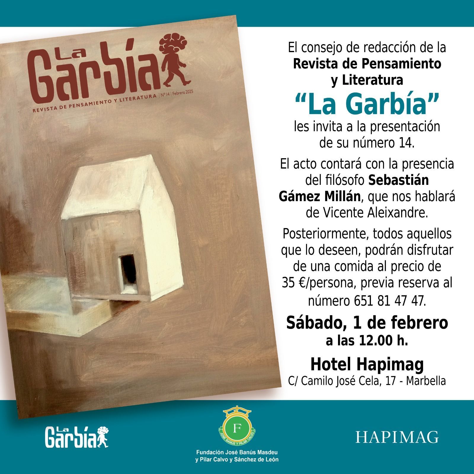 El consejo de redacción de La Garbía, Revista de Pensamiento y Literatura, tiene el placer de invitaros a la presentación de su nuevo número, el 14, que se celebrará el próximo sábado, 1 de febrero, a las 12:00 h en el Hotel Hapimag, ubicado en C/ Camilo José Cela, 17, Marbella.